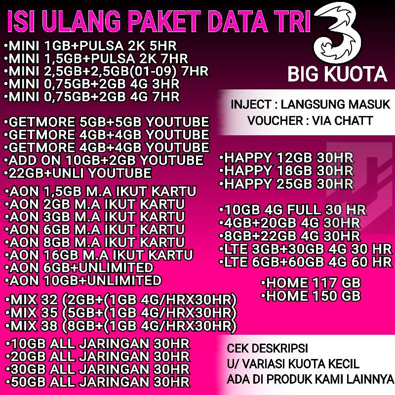 Terjual KUOTA DATA INTERNET TRI THREE INDOSAT TELKOMSEL ... from s.kaskus.id Produk baru operator atau provider tri indonesia (3) atau three ini mengusung paket yang always mode grab bulk fisik, jadi masih melebih murahkan produk fisik ketimbang produk inject atau isi kuota alwayson 24 jam di semua jaringan tri indonesia dan masa aktif mengikuti masa aktif kartu. Price list harga inject kuota channel kuota. Mendapatkan kuota gratis 100 gb dari tri tentu bukan sesuatu yang mudah. Tri (3) juga menyediakan aplikasi yang membuat sahabat makin mudah untuk mengecek pulsa hingga kuota three 15.000. Kuota inject & voucher (read 86 times). Daftar agen pulsa bebas biaya pendaftaran (gratis!!!) master dealer terpercaya garansi 100% uang kembali. Cek kuota melalui aplikasi bimatri. Agen kuota inject tri 15gb / murah kuota xl combo lite inject xtra combo lite.
